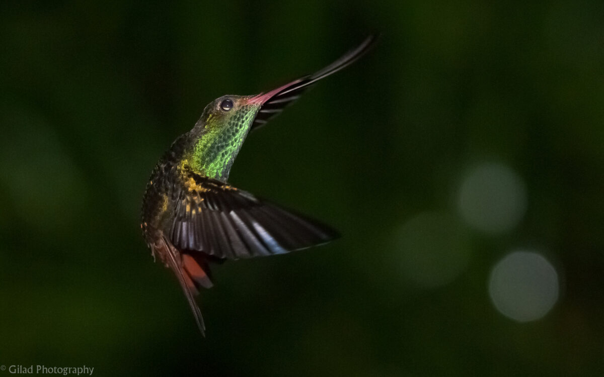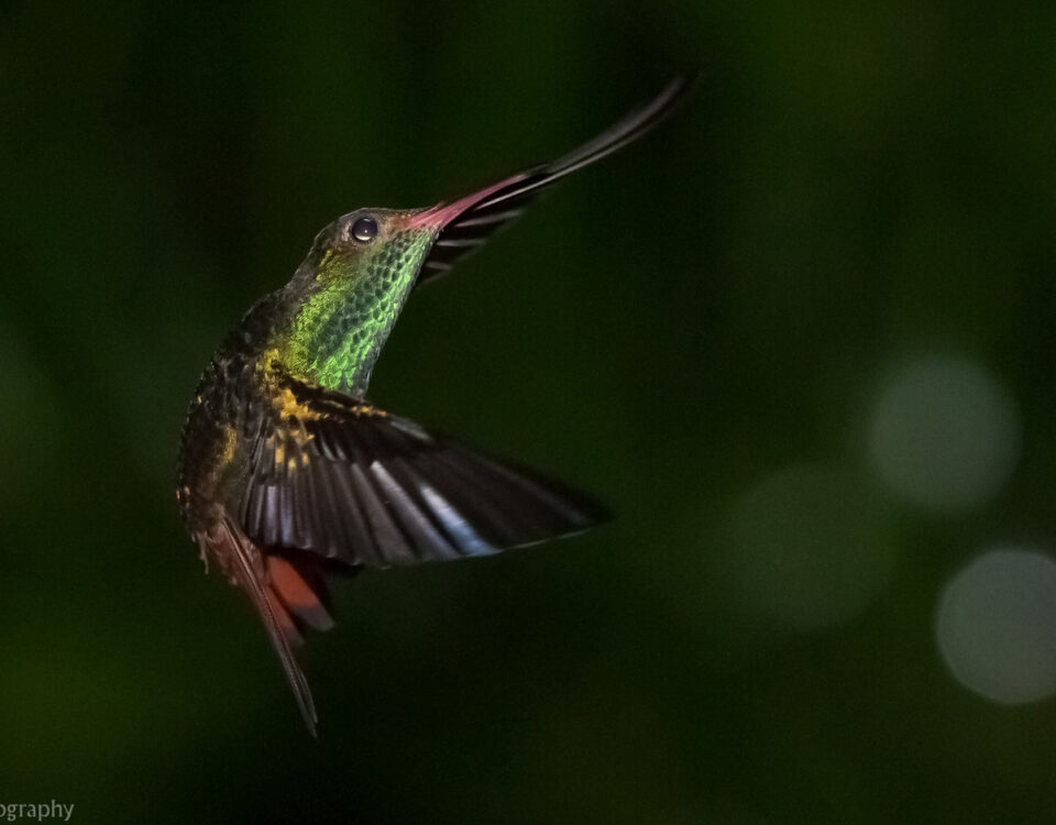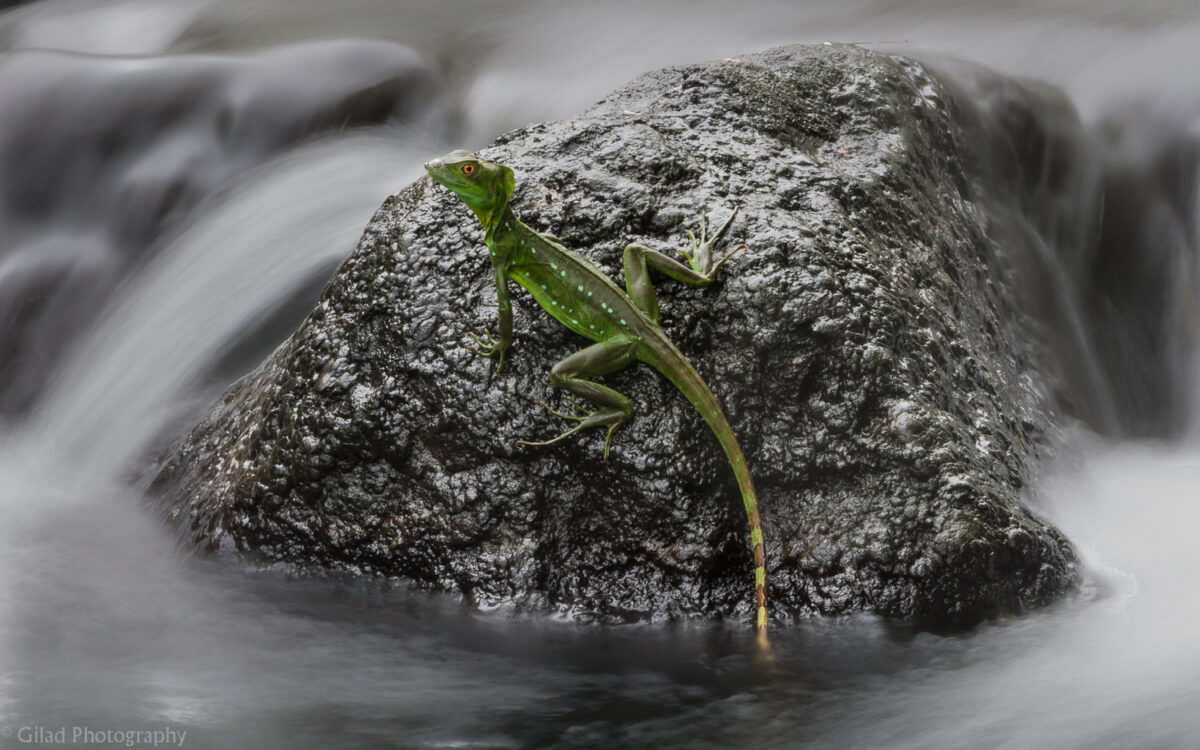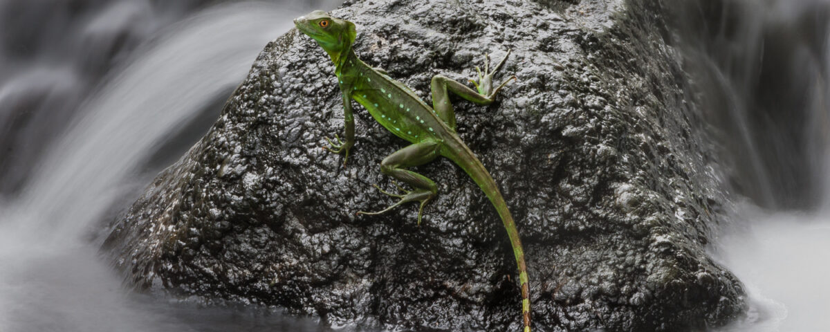 This little fellow showed up while I was in the water at the Tabacon hot springs in Costa Rica. I quickly went out to grab the camera, didn't have my tripod with me, so I braced the camera against the wooden railing, and took a picture (f/3.2 / 1/80sec). He was still standing there (like a statue ;), so being relaxed that I got the shot, I started closing down the Aperture: to gain more exposure time until this one came out (I was in Aperture: mode). I took a total of 7 frames in this 1 minute and 22 seconds span until he fled the scene 🙂